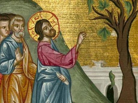 Через упоминание о смоковнице проводится скрытая параллель между духовным состоянием возмущенной толпы, отказавшейся от Христа, и первых людей, нарушивших заповедь в раю. В церковных песнопениях, с одной стороны, в один ряд поставлены отпавшие от Бога прародители и отрекшийся от Избавителя богоизбранный народ. На языке поэтических образов они одинаково «наги» перед Господом, т.е. лишены благодатной помощи, покровительства Божия. С другой стороны, познавший свою наготу Адам, «листвие смоковное взем, препоясался». Тем самым подчеркивается связь лишения Божественного покрова со смоковничным бесплодием, выражающим внутреннюю омертвелость человеческой души, не возрастающей в делании добра.