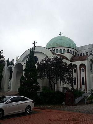 В 1903 году на купленном участке была выстроена Корейская Духовная Миссия. Среди корейцев она была известна как «русский монастырь» (Араса-савон) или «русская церковь» (Араса сени-дан). Прихожане заходили в Миссию с улицы Чони-донн Тэйдо через входные ворота в китайском стиле. Участок Миссии был огорожен невысокой кирпичной оградой. Внутри двора располагалось школьное здание с квартирой для учителя и классной комнатой, и другие постройки. Школа приспособлена под церковь, при ней устроена звонница для колоколов. Причем шесть колоколов для звонницы отливались еще в 1901 году в Москве. Все свободные от построек места на участке разбиты под сад и огород. Тенистый и прохладный сад Миссии особенно приятен жарким сеульским летом.