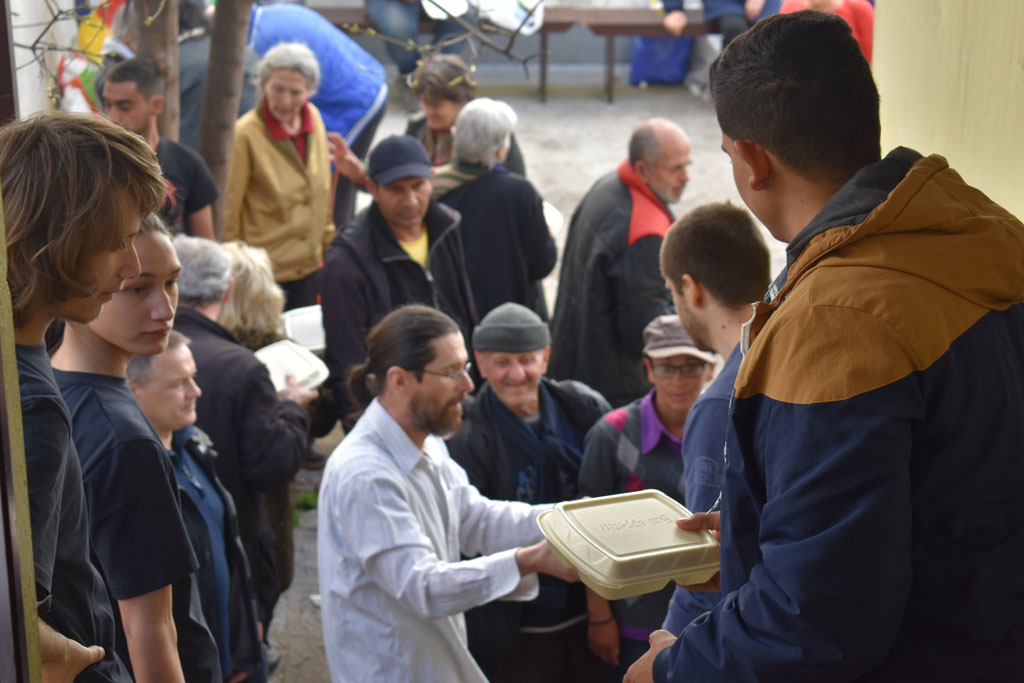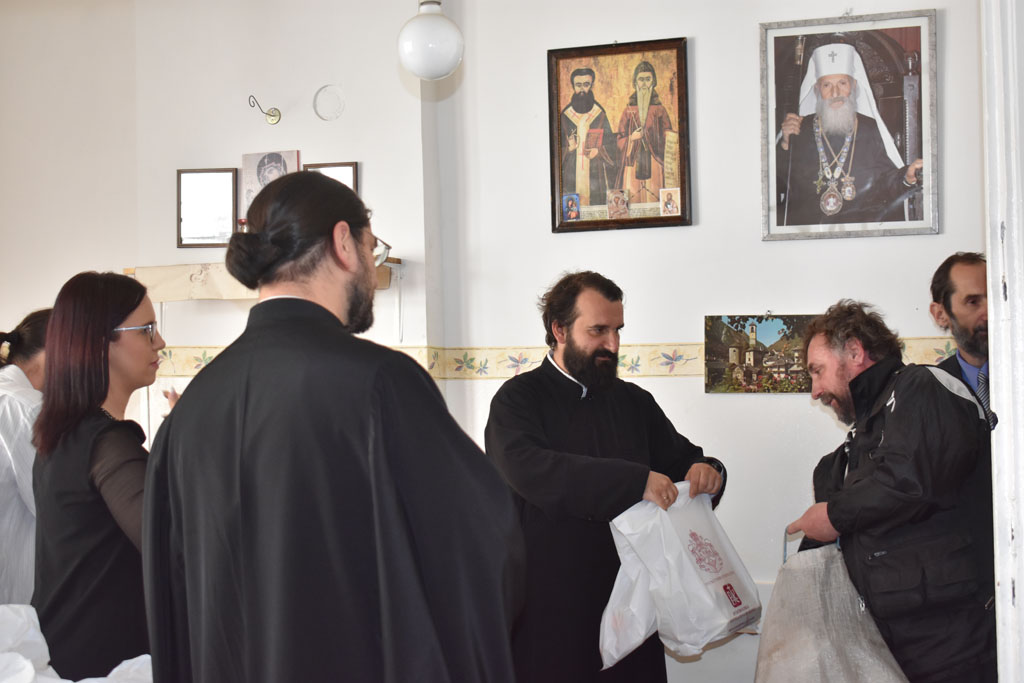 Док су се корисници кухиње окупљали, вредне куварице су спремале мекике, а свако је добио по неко задужење како би процес текао што ефикасније. Читаву процедуру координисао је Василије Ковачевић, увек задужен за рад волонтера. Јереј Владимир Марковић и ђакон Бранислав Јоцић делили су пакете, благосиљајући оне који су дошли.