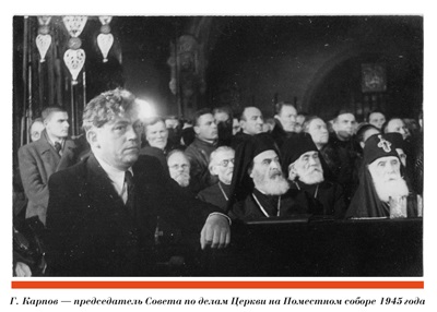 Новым «куратором» Церкви от органов госбезопасности стал полковник (с 1945 — генерал-майор) Георгий Карпов, назначенный председателем Совета по делам Православной Церкви при Совнаркоме СССР. Карпов имел в церковных кругах скверную репутацию: в довоенные годы удостоился ордена Красной Звезды за «операции против церковно-монархического подполья». В застенках под его началом с фигурантами-«церковниками» не церемонились. Неслучайно численность новомучеников и исповедников, пострадавших за веру с 1917 года, дважды превысила число святых, канонизированных за весь период существования христианства на Руси.