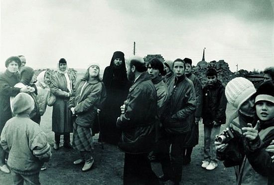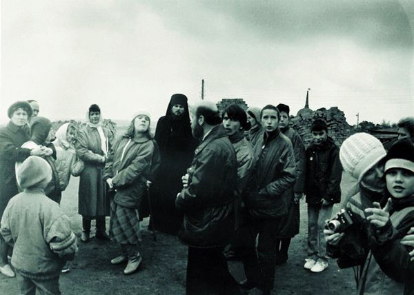 Чёрно-белая фотография, сделанная почти случайно: на фоне обломков кирпичных стен и далёких куполов монастыря, в куртках из дешёвой болоньи стоит группа людей, человек 15. Все в каком-то смятении — гримасничают, в камеру смотрят словно впервые, пальцами показывают. Среди них много тех, кого сердобольные люди называют «странненькими» (остальные их называют иначе). В глубине толпы, словно в кокон, кутается в мантию высокий монах.