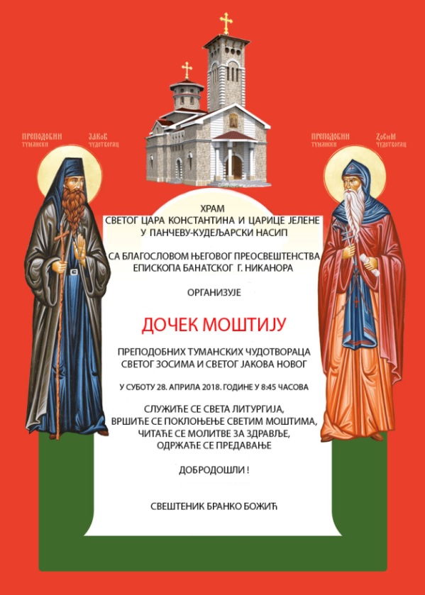 Храм Светог цара Константина и царице Јелене у Панчеву-кудељарски насип са благословом Његовог Преосвештенства епископа банатског г. Никанора организуjу Дочек моштију преподобних Туманских чудотвораца Светог Зосима и Светог Јакова Новог у суботу 28. априла 2018. године У 8:45 часова.