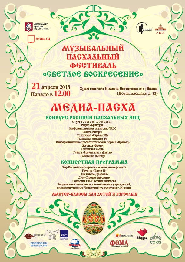 21 апреля 2018 года в Москве в рамках Музыкального пасхального фестиваля «Светлое Воскресение» пройдет ежегодный конкурс для представителей СМИ «МедиаПасха-2018», организованный Департаментом культуры города Москвы и Московской городской епархией, сообщает Патриархия.ru.