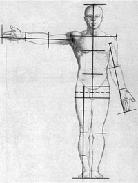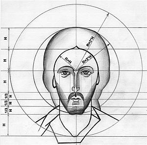 К тому, что сказано о носе, следовало бы добавить: в основе модульной системы византийского канона неслучайно лежит размер этой детали лица (рис. 2), во всяком случае так говорится в «Ерминии» Дионисия Фурнийского: «Сперва размерь голову, разделив ее на три части; в первой из них помести чело, во второй – нос, а в третьей – остальную часть лица, волосы же пиши за чертою этого яйца, на меру носа; кроме того, от носа до конца бородки отмерь три равные части, из которых две составят бородку, а одна – рот. Что касается до шеи, то она имеет меру носа. Потом от подбородка до средины тела отмерь три равные части и до колен две, отбавь на колена часть, равную носу. Далее еще две части отмерь до лодыжек и от них часть, равную носу, до подошвы да до ногтей одну часть… Что касается до глаз, то размер их одинаков, и расстояние между ними столь же длинно, сколько длинен глаз. Длина уха равна длине носа. Если человек рисуется нагой, то средина его вширь определяется четырьмя носами, а если в одежде – одним с половиной яйцом». Весь же «естественный рост человека от чела до подошвы измеряется девятью яйцами»[8]. Древние иконописцы, как и мастера эпохи Возрождения, в качестве единицы измерения человеческого тела брали, как видим, высоту головы. Но вот количество единиц во всем росте бывало разным и зависело от многих субъективных и объективных факторов.