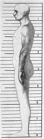 Тело человека Бог творил из праха, но как сотворил! Античные греки связывали вопрос о совершенстве с идеальным, гармоничным телом, ибо форма для них была отражением божественного образа. Еще раннехристианский писатель Климент Александрийский восхищался тем, что тело устроено «с великой премудростью по законам красоты и соразмерности»[9]. Это дает нам основание перейти к размышлениям о пропорциях человеческого тела. Мы будем рассматривать не их преломление в творчестве конкретных художников (ведь сколько художников, столько и особенностей пропорциональных соотношений), а их обобщенное типическое соотношение в «конструкции» тела. При этом будем иметь в виду, что «при изучении пропорций тела можно учитывать лишь средние размеры, наиболее часто встречающиеся в жизни», тем более что «средняя высота человеческого тела у различных рас различна»[10]. Нас интересует европеоид 25-летнего возраста, поскольку к этому времени прекращается формирование роста. По высоте его фигуры умещается восемь отрезков, каждый из которых равен длине головы (рис. 3, 4). Здесь встречаем число воскресения и вечности – 8[11]. Итак, «восьмиголовый» рост есть императивный символ, заложенный в тело человека от сотворения мира.