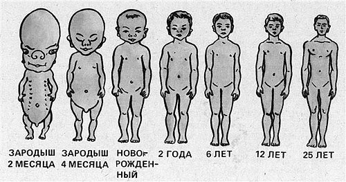 Существует одна особенность развития частей тела, о которой необходимо сказать. Иерархически самая значимая часть тела – голова[21] – в процессе жизни менее других меняется по своим размерам (рис. 5), поэтому новорожденный появляется на свет с крупной головой, почти в ширину плеч. Вес ее непомерен для младенца и практически треть года он учится удерживать голову с помощью мышц шеи. А вот ноги, иерархически наименее значимые, у малютки очень коротки, и за время развития тела, как никакая другая его часть, они вырастают, постепенно меняя пропорциональное соотношение частей тела.