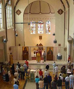 В принципе, говорить о православной жизни в сегодняшнем Маастрихте можно лишь с известной долей условности: община, официально основанная в 1976 году, переживает не лучшие времена. Литургии, как правило, совершаются по субботам, да и то раз в месяц. Служить приезжает духовенство из Девентера или Брюсселя (Бельгия). На службах, по крайней мере в те дни, когда я их посещал, было немногим более десяти человек. Служат обычно по-голландски. Юрисдикционно приход относится к Экзархату приходов Русской традиции Константинопольского Патриархата (что на рю Дарю в Париже).