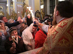 У входа в Свято-Александро-Невский храм, являющийся подворьем собора, правящего архиерея встречали по традиции — с освященным пасхальным куличом, знаменующим торжество Светлого Христова Воскресения.