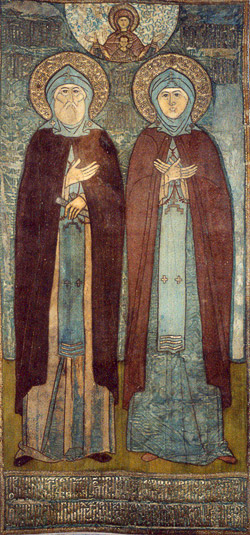 | Свв. Петр и Феврония Муромские. Покров на раку с мощами. XVI в. |