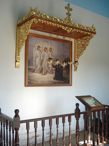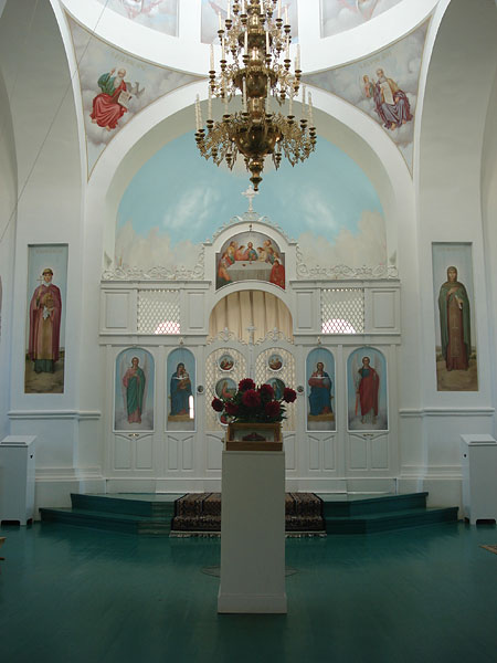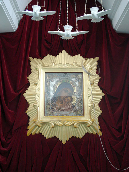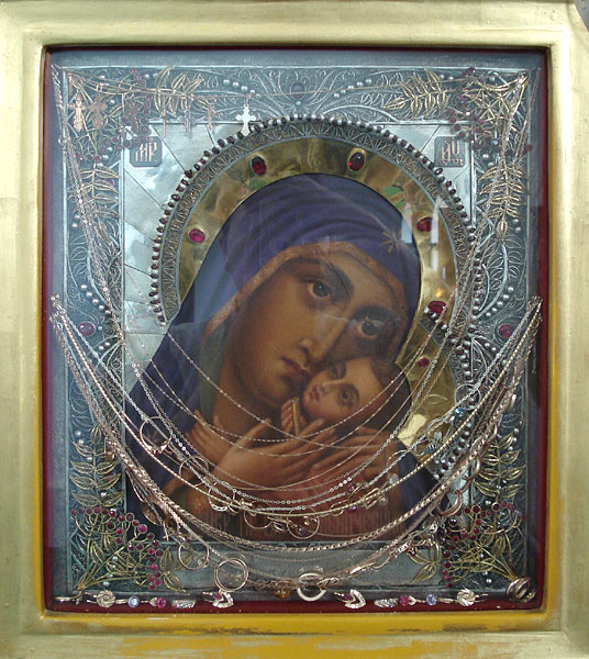 Интерьер церкви в честь Покрова Пресвятой Богородицы | Чудотворная икона "Умиление-Тервеническая" | Серебряный обруч богомольцы надевают на голову во время молитв перед иконой |