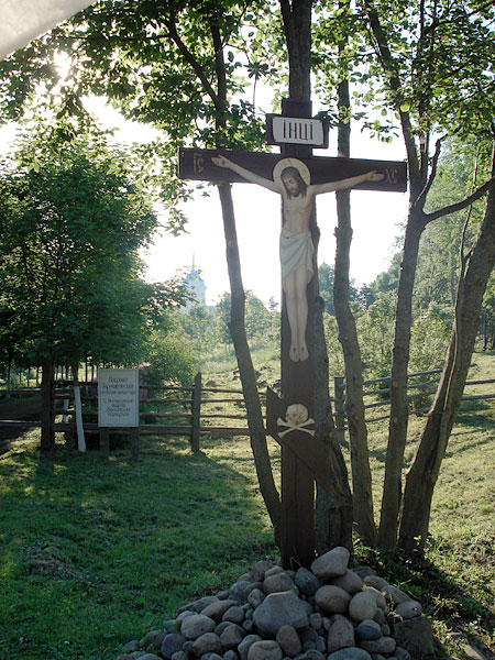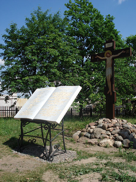 Вход в Введено-Оятский монастырь со стороны реки Ояти | Мраморная книга-помянник перед поклонным крестом на месте разрушенного алтаря | Введенская церковь |