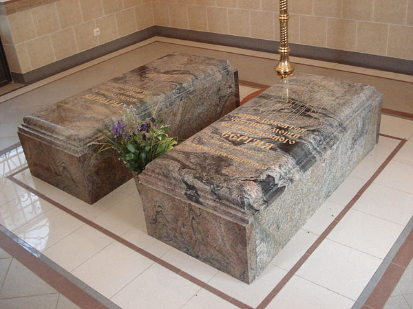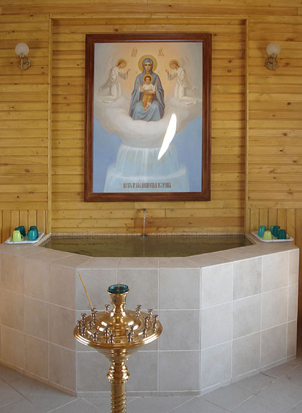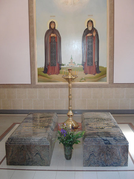 Интерьер часовни. Очерченный квадрат 2х2 м указывает место захоронения свв. мощей | Каменные раки над местом захоронения прпп. Сергия и Варвары | Знаменитый радоновый источник Введено-Оятского монастыря |