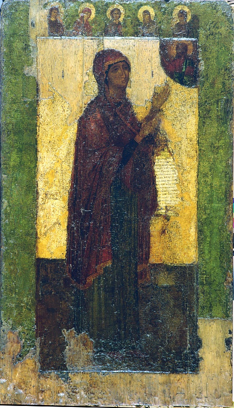 Сверху написаны Спас, Богородица, Иоанн Предтеча, Архангелы Михаил и Гавриил – в этом предание видит изображение личных моленных икон князя Андрея Боголюбского.