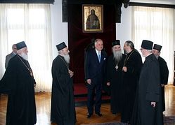 На приеме присутствовали члены Святейшего Архиерейского Синода Сербской Православной Церкви епископы Жичский Хризостом, Бихачско-Петровачский Хизостом и Милешевский Филарет.