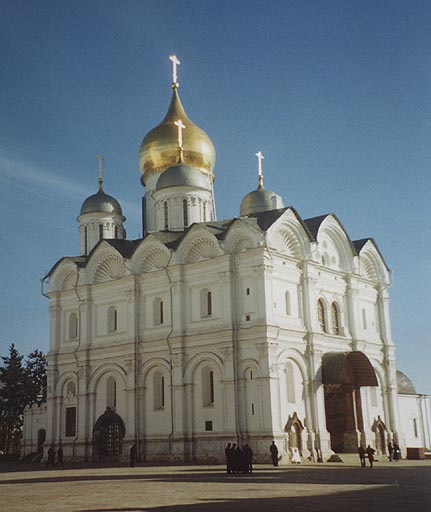 5-главый собор был возведен в традициях русского храмового зодчества в 1505-1509 годах архитектором Алевизом Новым, одним из итальянских мастеров, приехавших по приглашению московского великого князя Ивана III строить Кремль. Росписи делали лучшие русские мастера 16-17 веков.