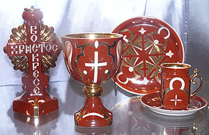 С 90-х годов XX века завод стал получать заказы от Русской Православной Церкви. Целый стенд выставки отведен под посуду и изделия церковной тематики: пасхальные яйца, чаши и сосуды для святой воды, распятия. Специально по заказу Оптиной пустыни Дулевским заводом был создан набор «Старый сад», в который входит пасхальное блюдо, подсвечники, емкости для святой воды. Все изделия этого набора выполнены в красных тонах и украшены позолотой. Всего таких наборов семь. Пять наборов было передано в Оптину пустынь, один хранится в музее Дулевского завода, а седьмой был преподнесен в дар Патриарху Московскому и всея Руси Алексею II.