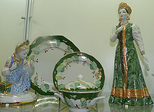 Основная продукция завода – это, конечно, самая разнообразная посуда. На выставке можно увидеть уникальные сервизы. Например, сервиз, изготовленный в подарок Мао Цзэдуну («Сказка»), или сервиз «Золотая осень» (художники Прохоров А.И., Леонов П.В.), который был рассчитан на 1200 персон и предназначался в подарок Теодору Рузвельту. Посуда поражает своей роскошью и изяществом.