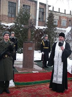 Перед началом церемонии протоиерей Владимир Силовьев – настоятель храма Рождества Богородицы и председатель Издательского совета – отслужил литию о упокоении Александра Алябьева на месте его символической могилы. Как пояснил отец Владимир, место реального захоронения Алябьева известно, оно находится недалеко от Рождественского храма, под зданием ДК ЗИЛ. Поэтому памятный крест был установлен у стен одного из древнейших московских соборов (которому в 2009 году исполняется 500 лет), где был расположен известный московский некрополь и где уже восстановлена память о нескольких исторических именах. Так, рядом с храмом в последние годы были торжественно отрыты памятные кресты над символическими захоронениями сподвижника Петра I, графа Федора Головина, а также героев Куликовской битвы, святых иноков Андрея Пересвета и Александра Осляби.