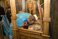 Archimandrite Tikhon on behalf of the brothers of Sretensky Monastery then presented Metropolitan Jonah with a “Vladimir” icon Mother of God and also books and electronic media published by the monastery.