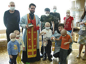 Иерей Даниил Луговой с пациентами РДКБ, куда 26 апреля 2009 г. впервые был доставлен Благодатный огонь