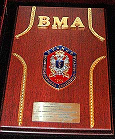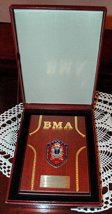 В знак благодарности за получение иконы и частицы мощей руководство ВМА в лице ее начальника генерал-майора профессора Миодрага Евтича просило меня вручить Его Святейшеству в подарок юбилейный знак – герб Военно-медицинской академии. На нем написано: «Его Святейшеству Патриарху Московскому и всея Руси господину Кириллу во славу православного братства и христианской любви». А также монографию на сербском и русском языках, рассказывающую об истории и сегодняшнем дне ВМА.