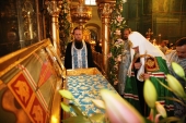 Перед началом молебна Предстоятель Русской Православной Церкви поклонился честным мощам святителя Тихона и обратился к богомольцам с Первосвятительским словом: