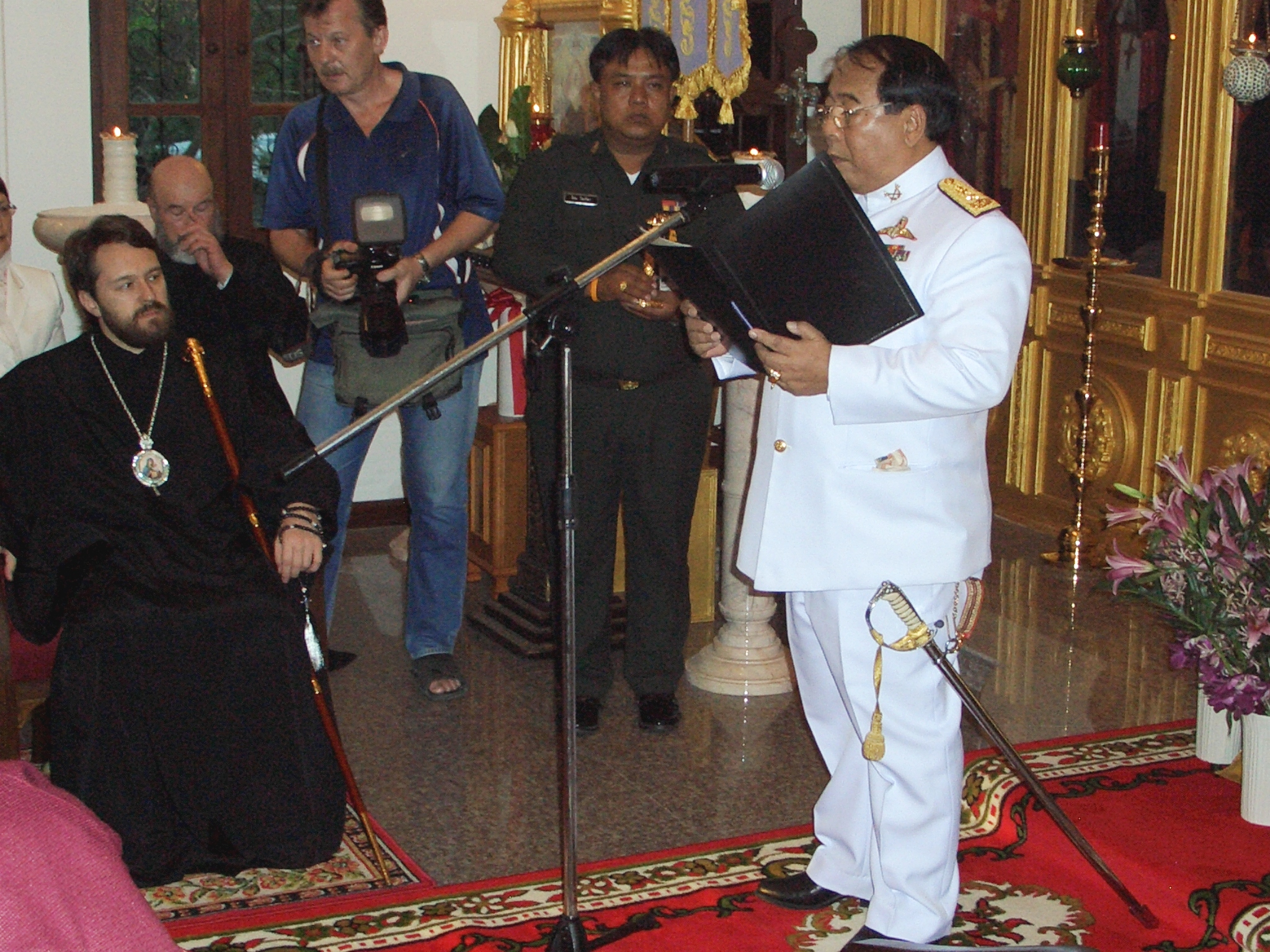 Затем секретарь Комитета обороны Парламента Таиланда генерал Чантоза торжественно приветствовал собравшихся от имени короля Раммы IX и государственных властей королевства. Отметив покровительство короля всем традиционным религиям, представленным в Таиланде, генерал Чантоза положительно оценил православное присутствие в государстве. Генерал также высоко оценил труд представителя Русской Православной Церкви в Таиланде архимандрита Олега (Черепанина) и выразил надежду на дальнейшее организационное развитие православных общин в стране. По мнению представителя тайского правительства, важно, чтобы и впредь сохранялись целостность и единство православного присутствия в Таиланде.