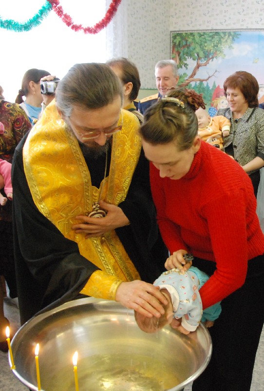 По благословению митрополита Днепропетровского и Павлоградского Иринея Таинства Крещения и Миропомазания над малышами-сиротами совершил викарий Днепропетровской епархии епископ Новомосковский Евлогий. Его Преосвященству сослужили благочинный Второго городского церковного округа протоиерей Ярослав Сытник, клирик Трехсвятительского храма протоиерей Петр Боровец и настоятель Свято-Троицкого храма протоиерей Александр Горбалюк. На празднике «духовного рождения» детей присутствовали и представители власти — главный специалист Главного Управления охраны здоровья Днепропетровской облгосадминистрации Ирина Ивановна Солохина, привезшая подарки.