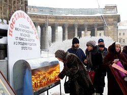 Несмотря на морозный день, многие прохожие подходили к участникам стояния и, ознакомившись с содержанием сопроводительных стендов, ставили свечи. Некоторые задерживались, чтобы помолиться.