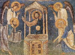Обратим еще внимание на внешнюю форму образа. Надо заметить, что для изображения того, что око не видело, ухо не слышало и что на сердце человеку не приходило (ср.: 1 Кор. 2: 9), нет на человеческом языке ни точных слов, ни образов. Поэтому Церковь, движимая Духом Святым, придала церковному изображению лишь подобие (символ), с одной стороны, мира видимого, с другой – мира невидимого.