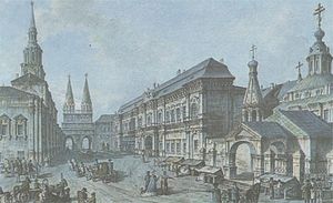 Первое здание Московского университета на Красной площади (слева). Безымянная гравюра. Начало XIX в.