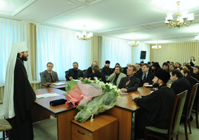 Перед началом заседания члены профессорско-преподавательской корпорации и учащиеся Общецерковной аспирантуры поздравили архипастыря с возведением в сан митрополита. От лица сотрудников учебного заведения Владыку Илариона приветствовали проректор протоиерей Владимир Шмалий и заведующий кафедрой управления и канонического права, директор Церковно-научного центра «Православная энциклопедия» С.Л.Кравец, а от лица учащихся – архимандрит Иоанн (Павлихин) и протоиерей Николай Ким.
