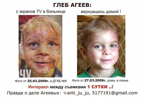 Но и это, и показания многочисленных свидетелей в пользу того, что родители не избивали Глеба (так, педагоги, занимавшиеся с ним и Полиной четыре раза в неделю в развивающем кружке, заявили в суде, что регулярно видели мальчика в майке и шортиках, и никогда никаких побоев не было, в том числе и за день до происшествия 20 марта), и объяснения родителей, до сих пор категорически отрицающих свою вину, – все это потонуло в море журналистской истерии. В СМИ тиражировались фотографии маленького Глеба, украденные корреспондентами у Агеевых и не имевшие никакого отношения к случившемуся. Одна была сделана в кафе. Руки Глеба, испачканные в клюквенном соусе, были представлены журналистами как измазанные кровью. Хотя в кафе тогда же была сделана целая серия снимков, где Глеб еще не успел измазаться. Ими, естественно, пренебрегли.