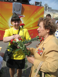 После этого активисты православных молодежных организаций Москвы поехали поздравлять ветеранов на Поклонной горе и у Большого театра, традиционных местах празднования дня Победы. Ребята раздали более 2000 открыток и цветов.