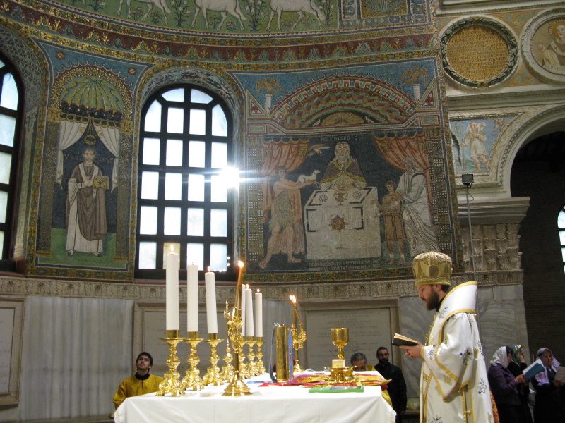 Когда много лет назад я впервые посетил Равенну, будучи еще иеромонахом и студентом Оксфордского университета, меня особенно поразил именно этот храм святителя Аполлинария в Классах. Священное изображение, которое присутствует здесь в алтарной апсиде, как мне кажется, не имеет себе равных среди памятников раннехристианского искусства по силе воздействия, по богословскому содержанию. Тогда, еще будучи студентом, я почувствовал желание когда-нибудь в этом святом храме совершить Божественную литургию. И вот сегодня это желание, которое я хранил на протяжении многих лет, исполнилось.