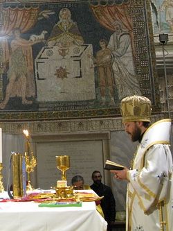 Я хотел бы поблагодарить архиепископа Равеннского Джузеппе Веруччи за разрешение нам совершить здесь богослужение. Благодарю настоятеля нашего прихода в Равенне отца Марка за подготовку этой божественной службы и за труды, которые он несет в этом граде и во граде Болонье. Благодарю всех священнослужителей, которые собрались сегодня здесь, и всех вас, дорогие браться и сестры. Призываю вас твердо и крепко хранить веру православную.