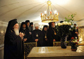 В завершение своего пребывания в Троице-Сергиевой Лавре Святейший Патриарх Варфоломей и сопровождающие его лица посетили крипту Успенского собора с храмом во имя Всех святых, в земле Российской просиявших, и пропели «Вечную память» погребенным в ней Святейшим Патриархам Московским и всея Руси Алексию I и Пимену.