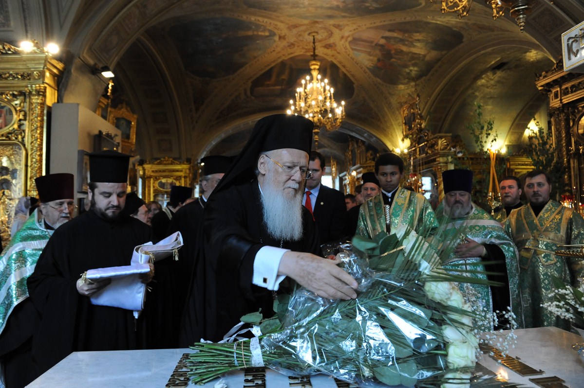 У входа в кафедральный собор Святейшего Патриарха Варфоломея встречали клирики храма и прихожане. От имени духовенства и прихожан Богоявленского собора Предстоятелю Константинопольской Православной Церкви был преподнесен букет белых роз. Почетный настоятель храма протопресвитер Матфей Стаднюк преподнес Святейшему Патриарху Варфоломею складень и панагию. Благословив верующих, Предстоятель Константинопольской Православной Церкви возложил цветы к гробнице Святейшего Патриарха Алексия II и совершил заупокойную литию. Ему сослужили члены греческой делегации в священном сане.