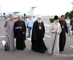 В аэропорту Предстоятеля Украинской Православной Церкви встречали митрополит Одесский и Измаильский Агафангел; епископ Белгород-Днестровский Алексий, викарий Одесской епархии; председатель Одесской областной государственной администрации Э.Л. Матвийчук, председатель Одесского областного совета Н.Л. Скорик, народные депутаты Украины.