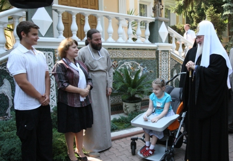 Святейший Патриарх Кирилл благословил девочку, страдающую детским церебральным параличом, и подарил ей специальную коляску для детей с ограниченными возможностями