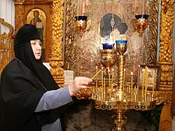 Сейчас здесь есть все удобства. А в теплой трапезной найдется и рыба, и фрукты, овощи, каша, чай, сладости. Пищу принимают дважды в день. Однако при необходимости желающие могут слегка перекусить на кухне и в другое время. День начинается в семь часов утра, а заканчивается в десять вечера. Все время сестры проводят в трудах неустанных. Одни из них выполняют должностные обязанности, – например, казначея, ризничей, регента, а другие несут так называемые общие послушания. По словам матушки Иоанны, сестер у нее не хватает – надо бы еще человек пять.