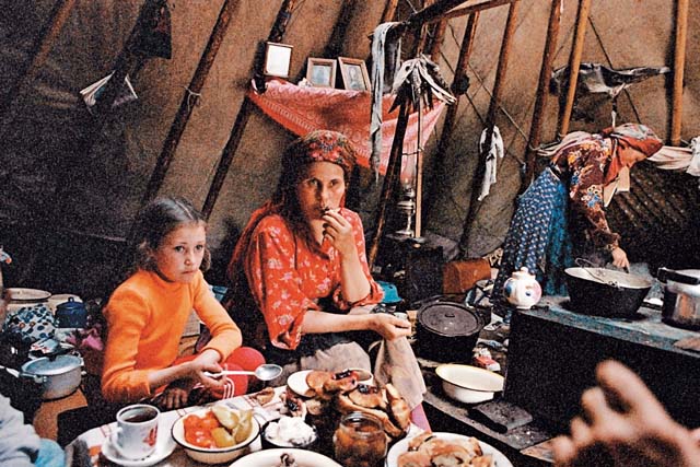 Таня Попова и ее мама сидят в чуме у очага. Кругом