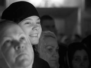 на заднем плане лицо настороженное, оценивающее; на переднем - разглядывающе-созерцательное; и между ними - лицо молодой девушки с теплой открытой улыбкой, снимающей все дистанции...