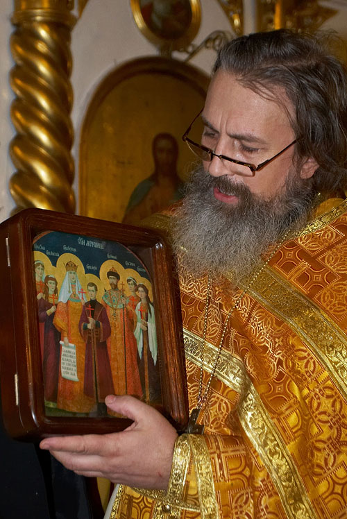 Иерей Константин Кобелев с иконой Царственных мучеников. Фото: Денис Полунин Народ знает своих заступников и ходатаев перед Богом. И, наверное, первым среди них для прихожан и служителей храма был святой царь-мучник Николай II.