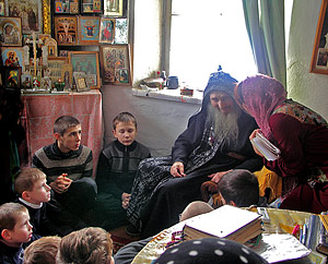 Входим в домик. Маленькие сенцы, куда попадаешь с улицы, кухня и комната – вот и вся площадь. Нас встречает келейница Раиса Михайловна: «Раздевайтесь, проходите, батюшка вас ждет». Детские глаза устремлены на батюшку, подходим под благословение. Кто-то из детей потом признался, что впервые брал благословение у схимника, до этой встречи «видел схимников только в кино и на картинках».