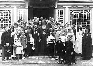 | Епископы Ювеналий и Димитрий (Вознесенский), родитель митрополита Филарета, среди духовенства и богомольцев Казанско-Богородицкого монастыря в г. Харбине. |