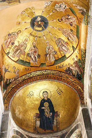 Среди мозаик храма только пять евангельских сцен: Благовещение (не сохранилось), Рождество Христово, Сретение и Крещение в парусах под тимпаном[4] купола, а также Пятидесятница в малом куполе над алтарем. В абсиде[5] представлена фигура Богоматери с Младенцем, сидящей на троне. В полунишах изображены отцы Церкви - святые Василий Великий, Николай Мирликийский, Григорий Богослов, Иоанн Златоуст. В диаконионе сохранились мозаики на ветхозаветные темы: Даниил во рву со львами и три отрока в пещи огненной.