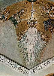 Крещение. Вторая половина XI века. Церковь Успения Богоматери, Дафни. Мозаика в тромпе. Над стоящим в воде Спасителем с древнейших времен изображался сегмент неба, из которого ко Христу нисходят голубь – символ Святого Духа и лучи «троичного света». Во многих памятниках, в том числе и знаменитых мозаиках главного храма монастыря Дафни под Афинами (вторая половина XI века), книжных миниатюрах и иконах изображается благословляющая десница Всевышнего, означающая «жест речи», глас с небес. Рассматриваемая мозаика находится в одном из тромпов, на которых покоится купол храма. Поскольку тромпы имеют криволинейную «вогнутую» поверхность, свет, падающий на мозаику, преломляется таким образом, что особым сиянием выделяется именно центральная часть сцены. Тем самым акцентируется момент явления Божества, теофании.