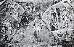Фреска церкви Спаса на Нередице. 1199 г. Новгород. Изображения Крещения в мозаиках Палатинской капеллы в Палермо и церкви Св. Луки в Фокиде (XII век) сходны с Богоявлением в Дафни. Наряду с использованной в них лаконичной иконографической схемой, в византийском и древнерусском искусстве была распространена более подробная. Так, во фреске церкви Спаса на Нередице (Новгород, 1199 г.) на берегу Иордана представлены раздевающиеся люди, ждущие своей очереди креститься. Один из них снимает рубаху, а другой изображен уже плывущим по воде. Обращает на себя внимание и то, что фигура Спасителя не обнажена, как в некоторых других памятниках, а имеет препоясание. В руке св. Иоанна Предтечи находится свиток – символ его проповеди о Христе народу. На воде, слева от Иисуса, начертано изображение креста как знака освящения мировых вод. Такое же изображение креста на воде, выделенное красным цветом, присутствует на иконе «Крещение» XIII века, хранящейся в монастыре св. Екатерины на Синае.