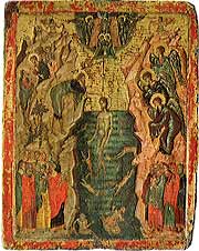 Крещение. Икона. Псков, середина XIV века. Государственный Эрмитаж. Слияние потоков Иора и Дана на древней псковской иконе (первая половина - середина XIV века, Государственный Эрмитаж) показано таким образом, что они образуют линию скалистого берега над головой Христа. Его фигура в воде оказывается заключенной в ущелье, напоминающее, по наблюдениям Л.И. Лифшица, бездну ада, символизируя очищенную от греха и обновленную крестной жертвой плоть Адама[2], в соответствии с текстом Послания апостола Павла к римлянам: «Елицы во Христа Иисуса крестихомся, в смерть Его крестихомся. Спогребохомся убо Ему крещением в смерть, да якоже воста Христос от мертвых славою Отчею, тако и мы во обновлении жизни ходити начнем» (Рим. 6, 3-4). Л.И. Лифшиц отмечает, что в изображениях Крещения художники различными способами вводили мотивы, напоминающие о погребении Спасителя и Его Сошествии во ад. Так, с погребением ассоциировались изображения Христа, погруженного под воду с головой, а с Сошествием во ад – изображения Спасителя стоящего в Крещении на подножии, напоминающем, как во фресках Грачаницы (1321 г.), попираемые врата ада.